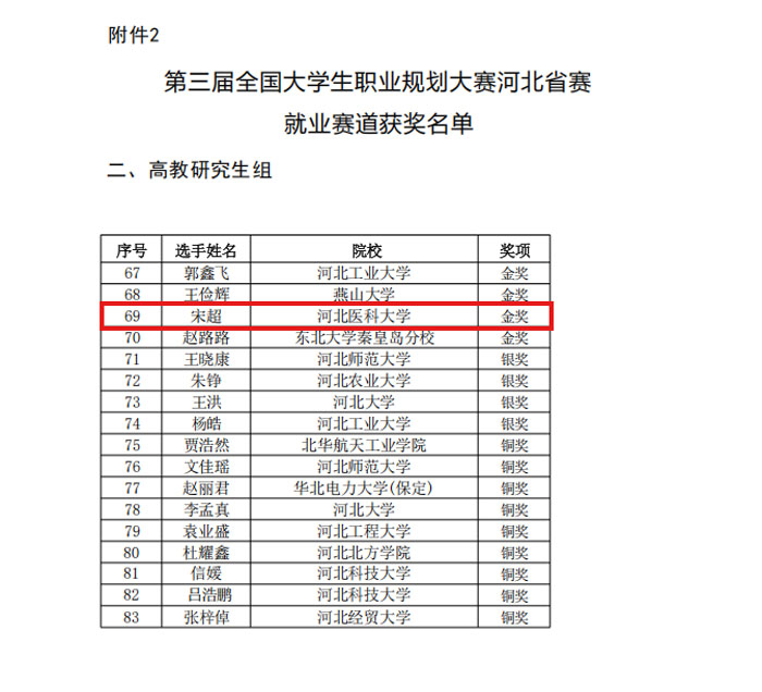 近日,第三屆全國大學生職業規劃大賽河北省大學生職業規劃大賽決賽在燕山大學落幕,我院2023級普外科專碩研究生宋超憑借扎實的專業積淀、清晰的職業定位與出色的現場表現,在眾多參賽選手的激烈角逐中脫穎而出,成功斬獲高教組就業賽道省級金獎,為學校與醫院贏得了榮譽,彰顯了我院學子深耕醫學領域、規劃職業未來的青春風采。