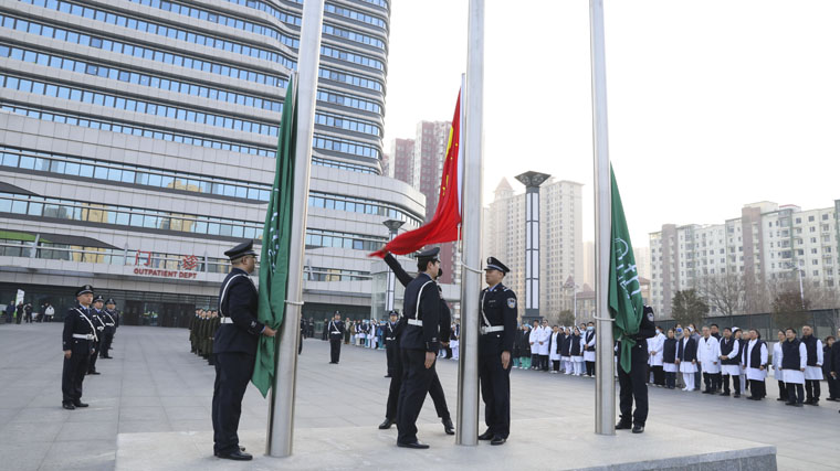 7點50分,隨著一聲響亮的口令,由醫院青年職工組成的國旗護衛隊邁著鏗鏘有力、整齊劃一的步伐,護送著鮮艷的五星紅旗走向升旗臺。在雄壯激昂的國歌聲中,全體人員肅然而立,面向國旗行注目禮。