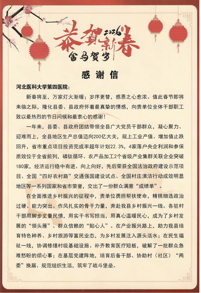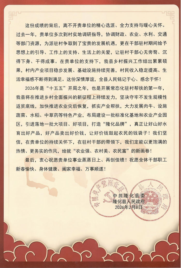 2月13日,我院黨委收到來自中共隆化縣委隆化縣人民政府的一封感謝信,信中高度肯定我院駐村干部在產業振興、民生福祉、基層黨建等方面的突出貢獻,提到駐村干部立足村情實際,用腳步丈量民情,用實干書寫擔當,用真心溫暖民心,成為了鄉村發展的“領頭雁”、群眾信賴的“貼心人”。信中還指出,我院協調爭取的財政、農業、水利、交通等多部門資源支持,為隆化縣鄉村振興注入了強勁動能,推動村級產業項目落地見效、基礎設施提檔升級、群眾增收渠道持續拓寬。