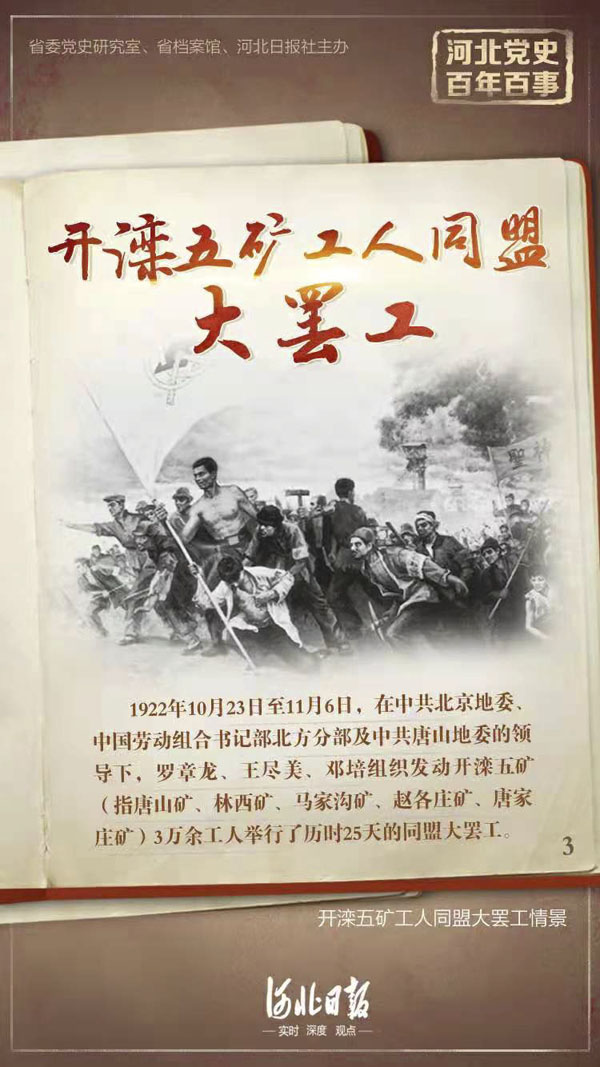 1922年10月23日,在中共北京地委、中國勞動組合書記部北方分部及中共唐山地委的領導下,羅章龍、王盡美、鄧培組織發動開灤五礦(指唐山礦、林西礦、馬家溝礦、趙各莊礦、唐家莊礦)3萬余工人舉行了歷時25天的同盟大罷工。此次罷工雖然在中外反動派的聯合鎮壓下沒有達到預期的目的,但在國內外產生了重大的影響。