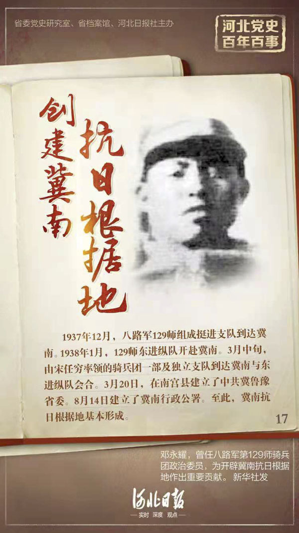 1937年12月,八路軍129師組成挺進支隊到達冀南,先后與駐隆平的冀南抗日游擊隊、直南臨時特委直接領導的冀南抗日聯軍會合。1938年1月,129師東進縱隊在司令員陳再道、政委李菁玉率領下,開赴冀南。3月中旬,由宋任窮率領的騎兵團一部及獨立支隊到達冀南與東進縱隊會合,確定了以南宮縣為中心向周圍發展創建根據地的方針。八路軍協同地方黨組織在冀南各地發動群眾,建立地方政權,改編各色武裝,組織抗日群眾團體。3月20日,在南宮縣建立了中共冀魯豫省委。同月,成立了統一戰線性質的冀南抗日軍政委員會,統一協調冀南各抗日武裝。8月14日建立了冀南行政公署。至此,西起平漢路,東至津浦路,北至滄石路,南越漳河、衛河的冀南抗日根據地基本形成。