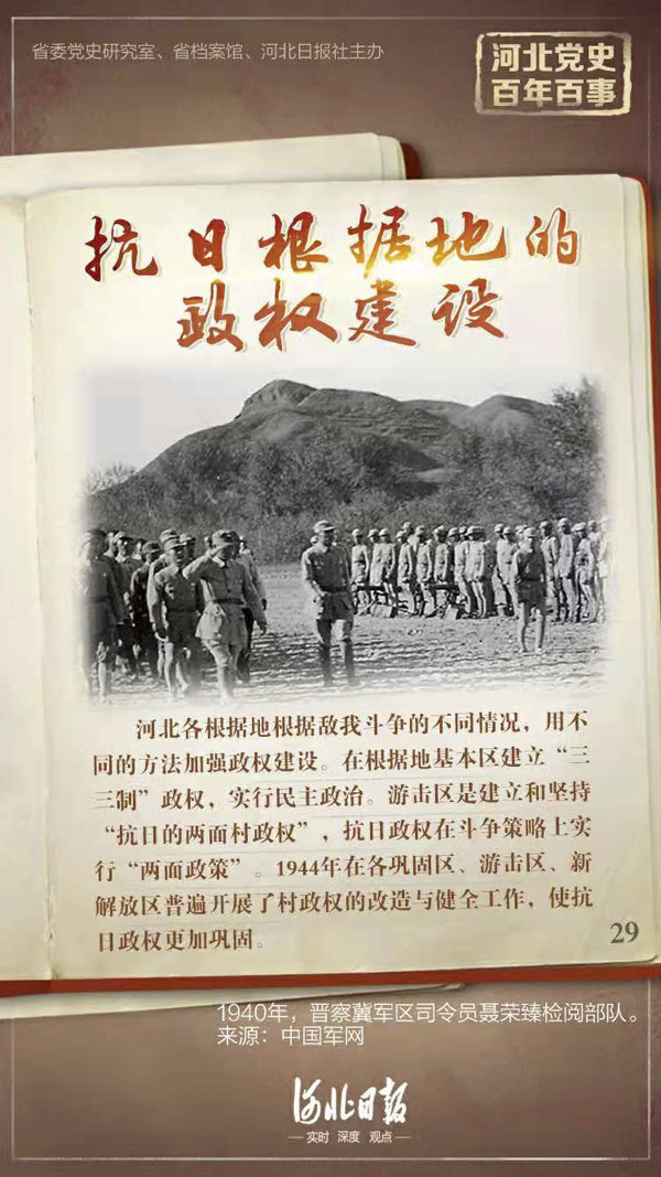 河北各根據地根據敵我斗爭的不同情況,用不同的方法加強政權建設。在根據地基本區建立“三三制”政權,實行民主政治。這種政策規定在政權工作人員中,共產黨員、非黨的左派進步分子和中間派應各占1/3。通過開展民主選舉運動,使河北各根據地的各級政權實現了“三三制”原則。游擊區是建立和堅持“抗日的兩面村政權”,抗日政權在斗爭策略上實行“兩面政策”。1944年在各鞏固區、游擊區、新解放區普遍開展了村政權的改造與健全工作,使抗日政權更加鞏固。根據中共中央的指示,河北各根據地從1942年開始精兵簡政。不斷加強政權建設,對鞏固和發展根據地起了重要作用。