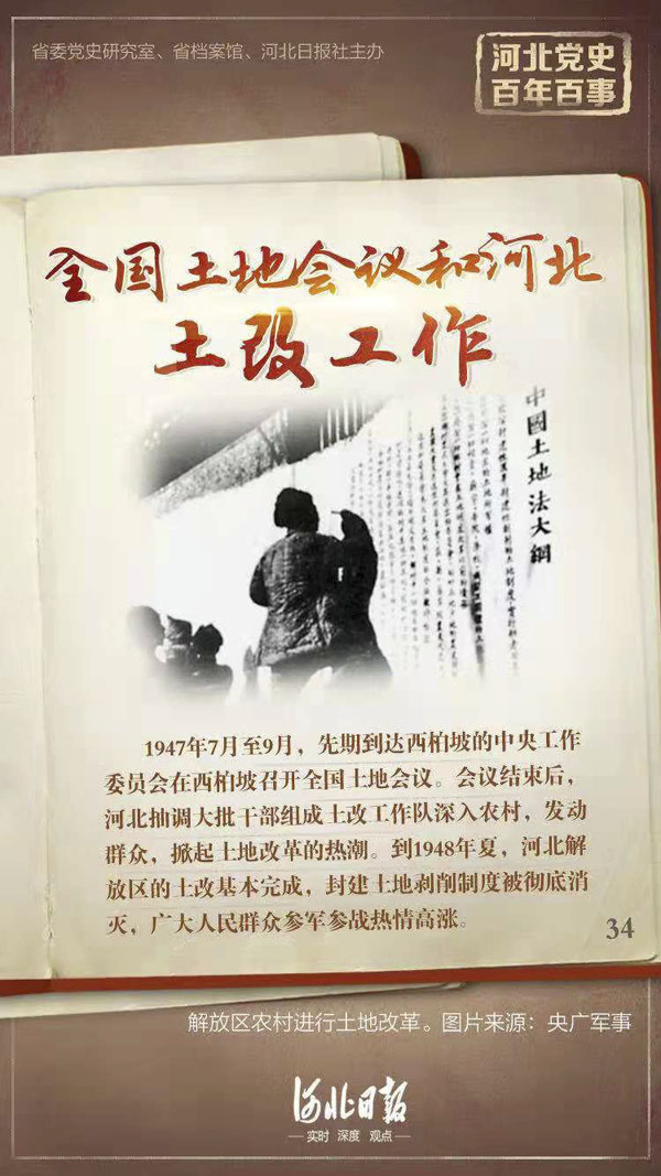 人民解放軍轉入戰略反攻之后,為充分調動人民群眾革命和生產的積極性,徹底改革農村土地制度,1947年7月至9月,先期到達西柏坡的中央工作委員會在西柏坡召開全國土地會議。會議總結了一年來土改工作的經驗,通過了《中國土地法大綱》,明確規定:廢除封建及半封建剝削的土地制度,實行耕者有其田的土地制度和分配土地的政策。會議結束后,河北抽調大批干部組成土改工作隊深入農村,發動群眾,掀起土地改革的熱潮。在河北的土改中,針對不同地區采取不同政策。土改進行徹底的地區進行檢查調整;不太徹底的地區實行徹底的土改,進行大范圍的抽調調劑;未實行土改的地區實行平分土地。在少數民族地區則貫徹執行民族政策。到1948年夏,河北解放區的土改基本完成,封建土地剝削制度被徹底消滅,廣大人民群眾參軍參戰熱情高漲。