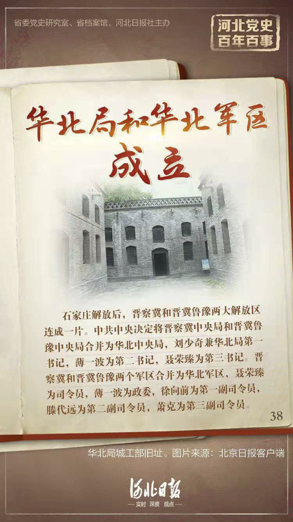 石家莊解放后,晉察冀和晉冀魯豫兩大解放區連成一片。為適應解放戰爭形勢發展的需要,劉少奇于1948年2月向中央建議,由于晉察冀和晉冀魯豫兩個解放區已經連成一片,而且局勢穩定,為了更有利于政治、經濟、文化的發展和解放戰爭的順利進行,應將兩區、兩局合并。很快,中共中央采納了他的建議,于5月9日作出決定:將晉察冀中央局和晉冀魯豫中央局合并為華北中央局,劉少奇兼華北局第一書記,薄一波為第二書記,聶榮臻為第三書記。晉察冀和晉冀魯豫兩個軍區合并為華北軍區,聶榮臻為司令員,薄一波為政委,徐向前為第一副司令員,滕代遠為第二副司令員,蕭克為第三副司令員,趙爾陸為參謀長,羅瑞卿為政治部主任。中共華北局和華北軍區的成立,為華北人民政府的誕生創造了條件。
