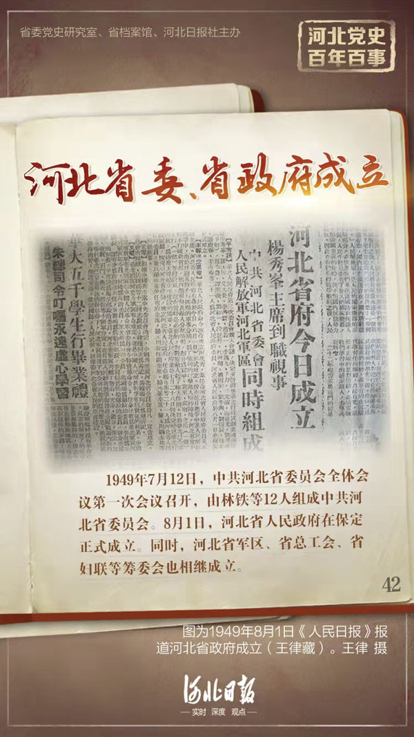河北全境解放后,成為奪取全國勝利的鞏固的大后方。為了加強領導,全力支援解放戰爭及盡快恢復國民經濟,1949年7月,中共中央決定恢復河北省建制,撤消冀中、冀東、冀南等區。7月12日,中共河北省委員會全體會議第一次會議召開,由林鐵等12人組成中共河北省委員會。林鐵任書記,馬國瑞任副書記。8月1日,河北省人民政府在保定正式成立,楊秀峰、羅玉川分別擔任正副主席。同時,河北省軍區、省總工會、省婦聯等籌委會也相繼成立。新成立的河北省由冀中、冀東區全部,冀南、太行一部分,察哈爾省的平西、易水、建屏專區組成,面積14.2萬平方公里。