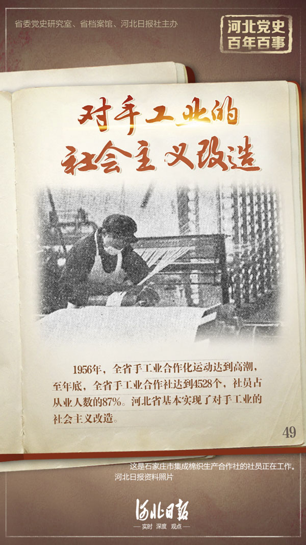 河北歷史上是個手工業比較發達的省。據1949年底統計,全省有32.4萬人從事各類手工業。但由于生產分散、設備簡陋,資金不足,所以生產效率很低。從1949年開始,河北省開始試辦手工業合作社,從貸款、供銷、稅收等各方面重點扶持,起到了很好的示范帶動作用。1951年8月,全省手工業生產合作會議召開,對試辦的合作社進行整頓和扶持。到1952年底,全省手工業合作社達到288個。1953年,在中央過渡時期總路線指引下,合作社進入穩定發展期。1954年1月,河北省委召開全省手工業工作會議,提出“積極領導,穩步前進”和“集資入股,自備工具,分工合作,按勞分配”的方針,推動了合作社的迅速發展。到年底,全省合作社發展到2896個。1955年12月,全省手工業合作社第一屆社員代表大會召開,從組織上、思想上為實現全省手工業合作化打下基礎,使1956年全省手工業合作化運動達到高潮。至年底,全省手工業合作社達到4528個,社員占從業人數的87%。河北省基本實現了對手工業的社會主義改造。