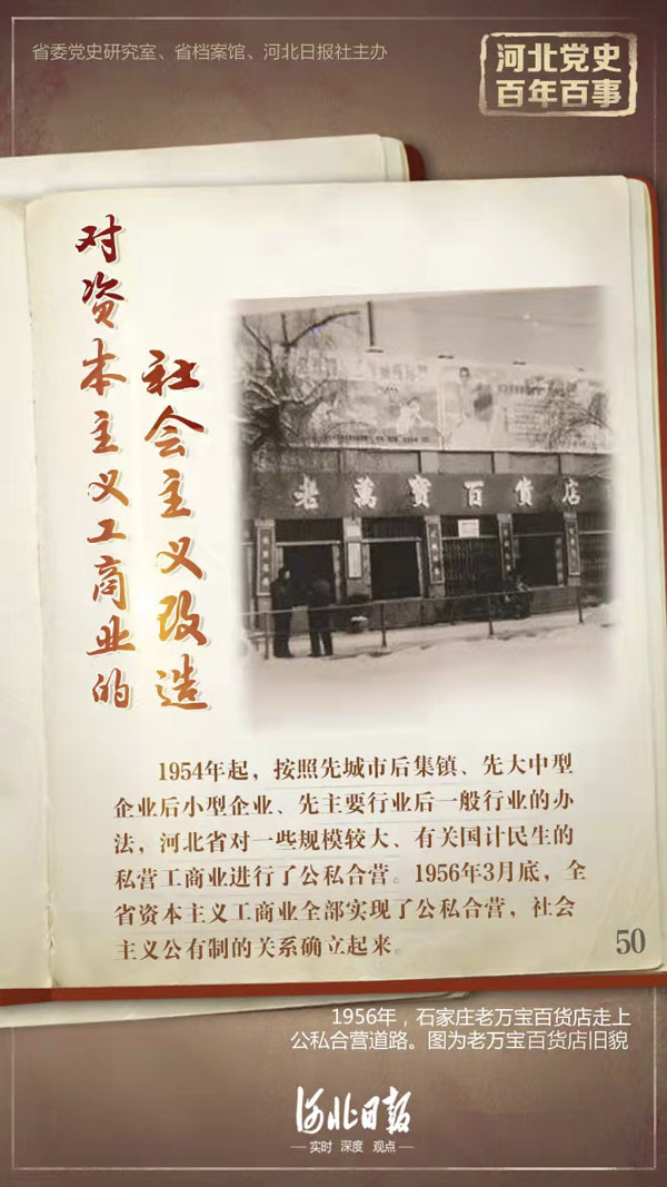 河北省的私營工商業在國民經濟中占有重要地位,從1953年到1956年,全省有計劃、有步驟地對資本主義工商業通過贖買和采取國家資本主義的途徑進行了社會主義改造。從1953年開始到1954年,河北省把私營工商業納入加工訂貨、統購包銷、代購代銷等初級的國家資本主義軌道。首先,國家對糧食、油料、棉花、豬肉、酒類等農產品、工業品中的商品部分和工業品貨源基本掌握起來;第二步,國營商業在流通領域逐步代替私營批發,使零售商只能依賴國營和合作商業貨源。從1954年起,按照先城市后集鎮、先大中型企業后小型企業、先主要行業后一般行業的辦法對一些規模較大、有關國計民生的私營工商業進行了公私合營。合營后,國家加強領導、擴大投資,使生產迅速發展,利潤不斷增加,從而吸引更多的私營企業要求合營,形成合營的有利形勢。1955年12月,省委成立對資改造領導小組,要求在兩年內按行業、分期分批完成改造任務。1956年初,對私營工商業的社會主義改造出現高潮。3月底,全省資本主義工商業全部實現了公私合營,社會主義公有制的關系確立起來。