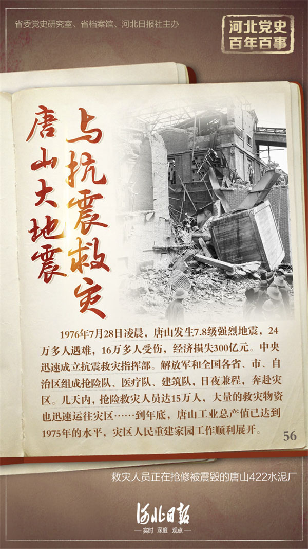 1976年7月28日凌晨3時42分,唐山發生7.8級強烈地震,造成24萬多人遇難,16萬多人受傷,經濟損失300億元。地震發生后,重病中的毛澤東得知消息后第一時間作出指示,委托中央其他領導同志組織抗震救災工作,要求迅速派慰問團去唐山,慰問災區人民,安置好災民生活。中央成立抗震救災指揮部,決定由河北省委、省軍區和北京軍區成立河北省唐山抗震救災前線指揮部和后勤指揮部,省委第一書記劉子厚等到現場領導抗震救災工作。解放軍和全國各省、市、自治區組成搶險隊、醫療隊、建筑隊日夜兼程,奔赴災區。幾天之內,搶險救災人員達到15萬人。同時,大量的救災物資也迅速運往災區。