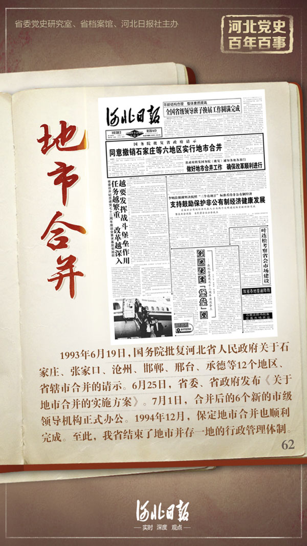 1993年6月19日,國務院批復河北省人民政府關于石家莊、張家口、滄州、邯鄲、邢臺、承德等12個地區、省轄市合并的請示。這次地市合并是一項重大行政管理體制改革措施,省委、省政府對這次合并十分重視,專門成立領導小組。6月25日,省委、省政府發布《關于地市合并的實施方案》,對地市合并的有關事宜作出明確規定。7月1日,合并后的6個新的市級領導機構正式辦公。1994年12月,保定地市合并也順利完成。至此,河北省結束了地市并存一地的行政管理體制。