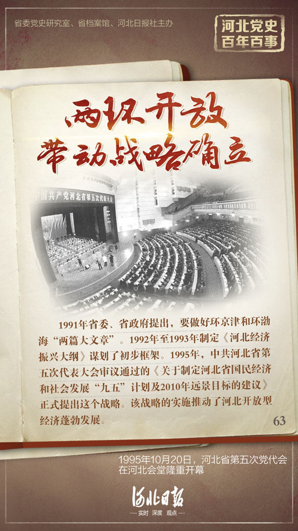 黨的十一屆三中全會后,在中央為推動全國經濟大發展而謀劃的幾個大的發展戰略啟發下,河北省委、省政府多次組織開展經濟、技術和社會發展戰略大討論,在此基礎上逐步論證提出和完善兩環開放帶動戰略。1991年河北省委、省政府提出,要做好環京津和環渤海“兩篇大文章”。1992年至1993年制定的《河北經濟振興大綱》謀劃了初步框架。1995年,在謀劃國民經濟“九五”計劃及2010年遠景目標的過程中,這個戰略更加明確。10月,中共河北省第五次代表大會審議通過的《關于制定河北省國民經濟和社會發展“九五”計劃及2010年遠景目標的建議》正式提出這個戰略。該戰略的實施推動了河北開放型經濟蓬勃發展。