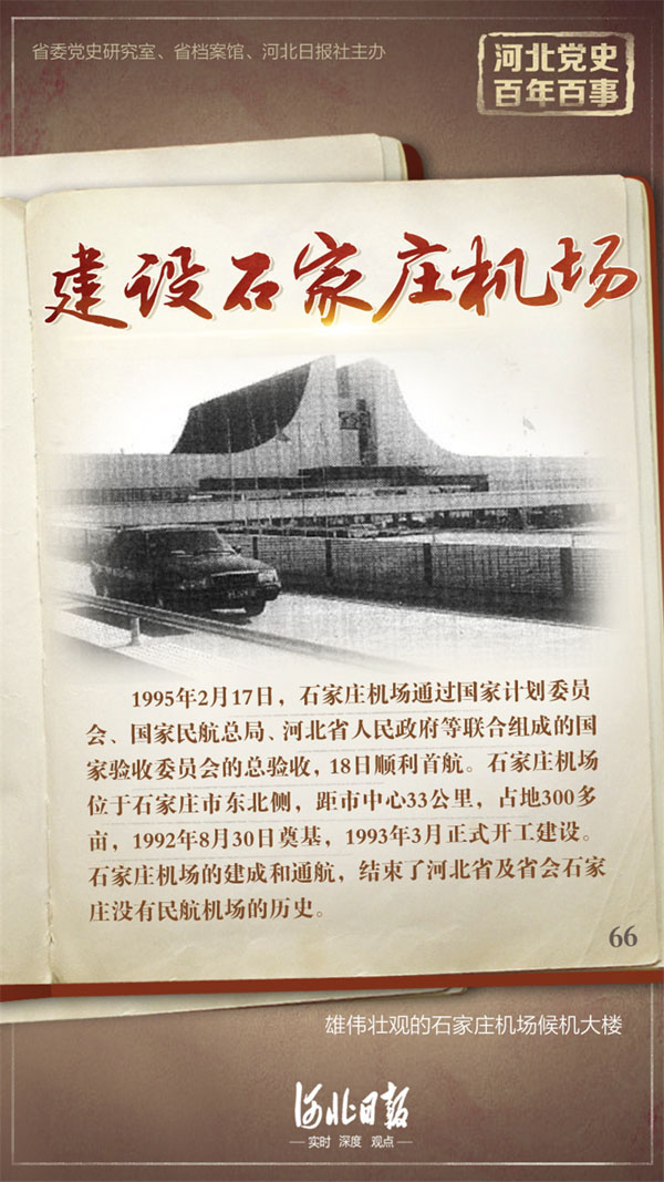 1995年2月17日,石家莊機場通過國家計劃委員會、國家民航總局、河北省人民政府等聯合組成的國家驗收委員會的總驗收,18日順利首航。石家莊機場位于石家莊市東北側,距市中心33公里,占地300多畝,1992年8月30日奠基,1993年3月正式開工建設。石家莊機場的建成和通航,結束了河北省及省會石家莊沒有民航機場的歷史。