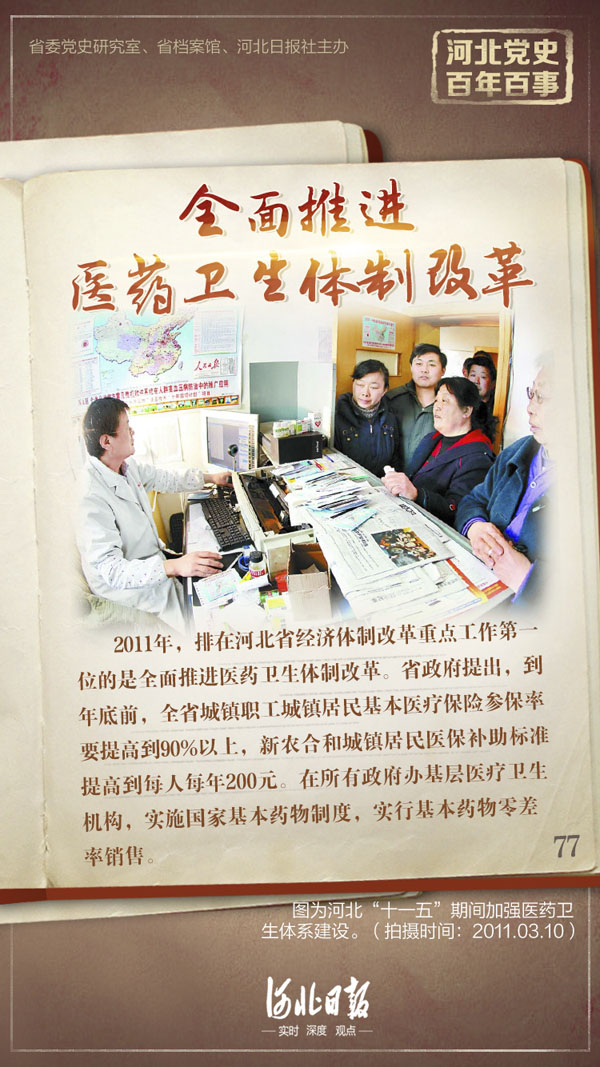 2011年,排在河北省經濟體制改革重點工作第一位的是全面推進醫藥衛生體制改革。河北省政府提出,到年底前,全省城鎮職工城鎮居民基本醫療保險參保率要提高到90%以上,新農合和城鎮居民醫保補助標準提高到每人每年200元。在所有政府辦基層醫療衛生機構,實施國家基本藥物制度,實行基本藥物零差率銷售。同步推進基層醫藥衛生體制綜合改革。3月25日,全省深化醫藥衛生體制改革會議提出,要深化醫藥衛生體制改革,切實把基本醫療衛生制度作為公共產品向全民提供,增強基層醫療衛生機構的服務能力,使更多的居民不出社區、不出鄉村就能看常見病、多發病,加快建立覆蓋全省的醫療保障體制機制,為保基本、強基層提供長效保障。當年,河北省政府先后出臺《關于全面推進醫藥衛生體制改革的意見》等15個文件,制定了多項配套措施,著力推動重點改革。