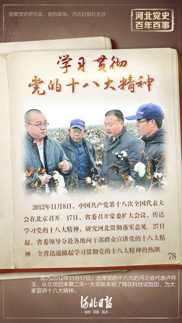 2012年11月8日,中國共產黨第十八次全國代表大會在北京召開。當天下午,河北省代表團在駐地分組討論胡錦濤總書記代表第十七屆中央委員會向黨的十八大所作的報告。大家表示,一定要認真學習,深刻領會,切實把思想和行動統一到黨的十八大精神上來,堅定不移地走中國特色社會主義道路,為全面建成小康社會而奮斗。17日,河北省委召開常委擴大會議,傳達學習黨的十八大精神,研究河北貫徹落實意見。27日起,河北省委領導分赴各地向干部群眾宣講黨的十八大精神。全省迅速掀起學習貫徹黨的十八大精神的熱潮,對廣大干部群眾統一思想,明確全面建成小康社會的主要任務,強化對中國特色社會主義的道路自信、理論自信、制度自信發揮了重要作用。