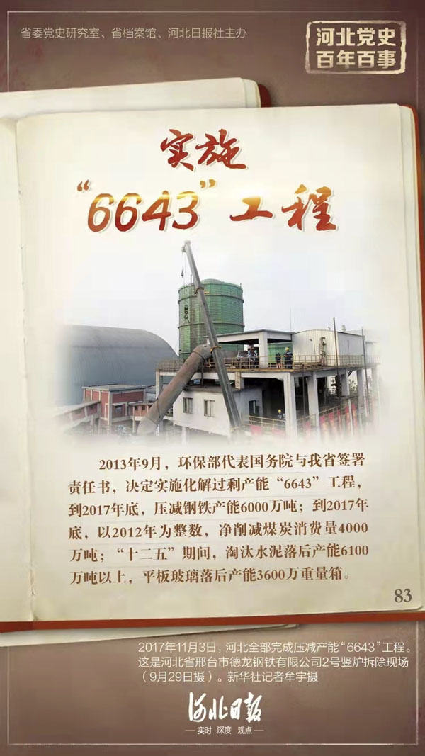 2013年9月,環保部代表國務院與河北省簽署責任書,決定實施化解過剩產能“6643”工程,到2017年底,壓減鋼鐵產能6000萬噸;到2017年底,以2012年為整數,凈削減煤炭消費量4000萬噸;“十二五”期間,淘汰水泥落后產能6100萬噸以上,平板玻璃落后產能3600萬重量箱。9月12日,河北省委、省政府印發《河北省大氣污染防治行動計劃實施方案》。根據方案,河北省采取50條措施,加強大氣污染綜合治理,改善全省環境空氣質量。總體目標是:經過5年努力,全省環境空氣質量總體改善,重污染天氣大幅度減少。力爭再用5年或更長時間,基本消除重污染天氣,全省環境空氣質量全面改善。9月27日,省大氣污染防治行動動員大會召開。省政府與各市簽訂大氣污染防治目標責任書。