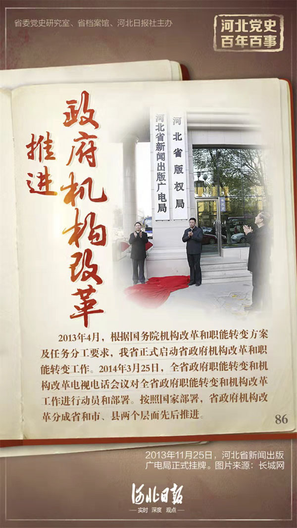 2013年4月,根據國務院機構改革和職能轉變方案及任務分工要求,河北省正式啟動省政府機構改革和職能轉變工作。《河北省人民政府機構改革方案》明確22項重點任務,其中對應國務院機構改革6項,結合河北實際16項。重新組建省食品藥品監督管理局。組建省衛生和計劃生育委員會;組建省新聞出版廣電局;調整省能源局職責;加強環境工作和執法力量;優化政府機構設置;改革省直機關管理企業體制。加快政府職能轉變是此次政府機構改革的核心和重點。省政府制定出臺《河北省政府職能轉變工作方案任務分工》,明確減少和下放投資審批事項、減少和下放生產經營活動審批事項等10類、共50項具體任務,其中對應國務院任務分工42項,結合河北實際增加8項,并分別明確38個牽頭和協辦部門,提出目標任務、完成時限等具體要求。2014年3月25日,全省政府職能轉變和機構改革電視電話會議對全省政府職能轉變和機構改革工作進行動員和部署。按照國家部署,省政府機構改革分成省和市、縣兩個層面先后推進。