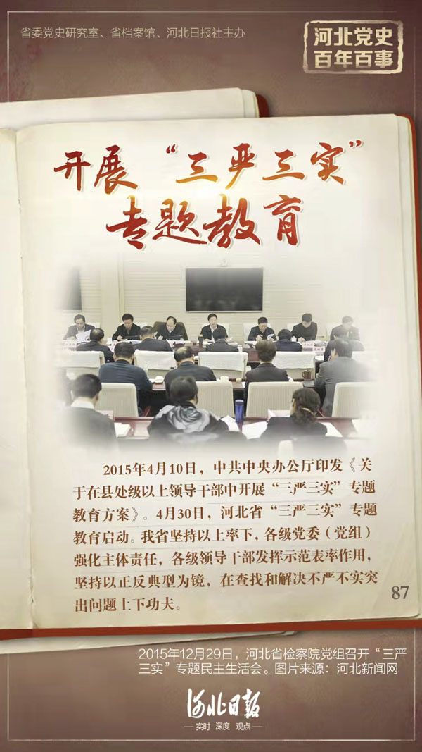 2015年4月10日,中共中央辦公廳印發《關于在縣處級以上領導干部中開展“三嚴三實”專題教育方案》。4月30日,河北省“三嚴三實”專題教育啟動。同日,省委“三嚴三實”專題教育聯系會議第一次會議召開。河北省堅持以上率下,各級黨委(黨組)強化主體責任,各級領導干部發揮示范表率作用,堅持以正反典型為鏡,在查找和解決不嚴不實突出問題上下功夫。各級各部門充分運用“兩種教材”“兩面鏡子”,教育黨員領導干部從先進典型中獲取精神力量,從反面典型中總結深刻教訓,結合召開專題民主生活會和組織生活會,嚴肅認真開展批評與自我批評,深入查找和整改不嚴不實問題。這次專題教育突出問題導向,對縣處級以上領導干部在思想、作風、黨性上進行又一次集中“補鈣”和“加油”,推動了領導干部踐行“三嚴三實”常態化、長效化。