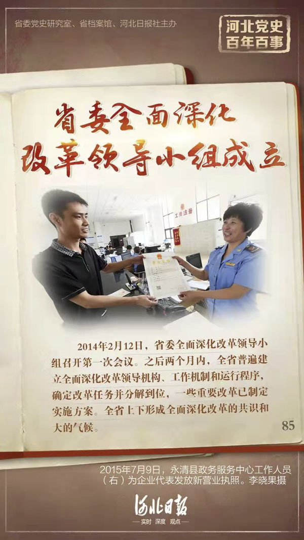 2014年2月12日,省委全面深化改革領導小組召開第一次會議,審議省委全面深化改革領導小組下設經濟體制和生態文明體制改革、民主法治領域改革、文化體制改革、社會體制改革、黨的建設制度改革和基層基礎工作改革、紀律檢查體制改革、農業和農村體制改革等7個專項小組人員名單;審議《省委全面深化改革領導小組工作規劃》《省委全面深化改革領導小組專項小組工作規則》《省委全面深化改革領導小組辦公室工作細則》以及《〈中共河北省委關于學習貫徹黨的十八屆三中全會精神的決議〉重要舉措分工方案》《河北省2014年全面深化改革重要舉措分工方案》。之后兩個月內,全省普遍建立全面深化改革領導機構、工作機制和運行程序,確定改革任務并分解到位,一些重要改革已制定實施方案。全省上下形成全面深化改革的共識和大的氣候。