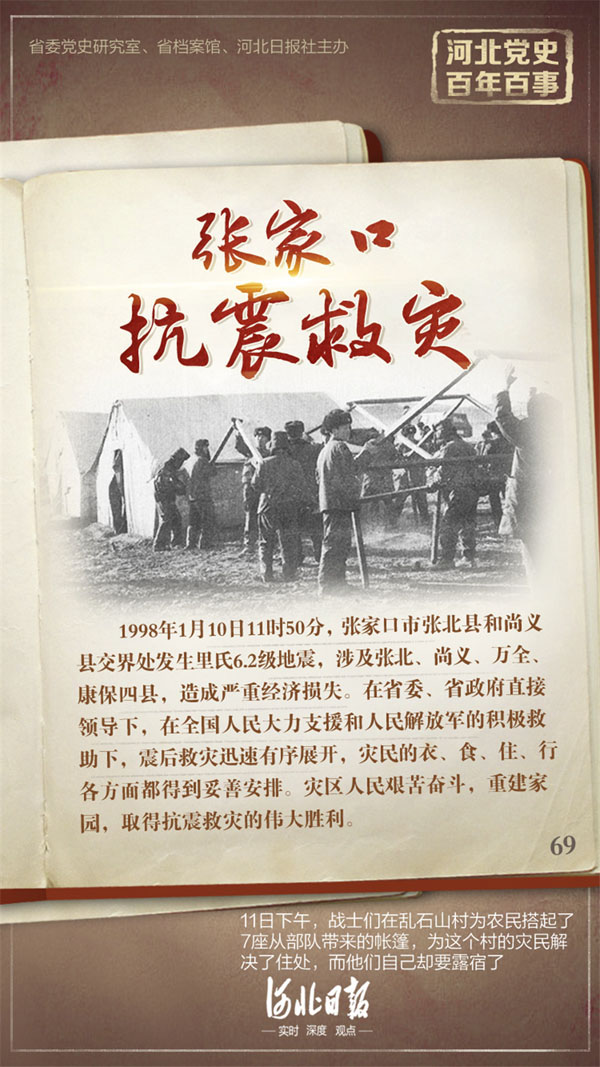 1998年1月10日11時50分,張家口市張北縣和尚義縣交界處發生里氏6.2級地震,涉及張北、尚義、萬全、康保四縣,共19個鄉(鎮)203個行政村16.89萬人,造成嚴重經濟損失。當天下午,中共中央總書記江澤民、國務院總理李鵬分別打電話向災區群眾表示慰問。在省委、省政府直接領導下,在全國人民大力支援和人民解放軍的積極救助下,震后救災迅速有序展開,災民的衣、食、住、行各方面都得到妥善安排。災區人民艱苦奮斗,重建家園,取得抗震救災的偉大勝利。
