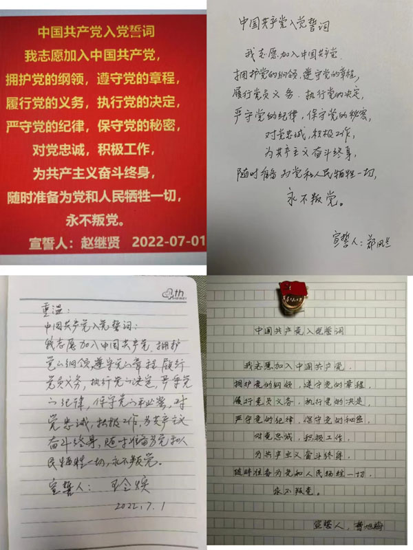 7月1日,第47黨支部舉辦了“學黨史、重溫入黨誓詞”主題黨日活動。支部書記賈麗同志帶領黨員、預備黨員和積極分子重溫入黨誓詞。之后,大家對黨史上的重大歷史事件進行學習討論,強化了“請黨放心、強國有我”的思想認識,大家表示,要凝聚黨員團隊戰斗力,為我院發展添磚加瓦。