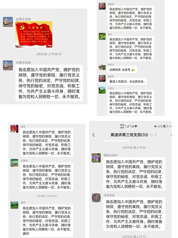 7月1日,離退休黨總支下屬各黨支部,在微信群分別開展了“重溫入黨誓詞 回顧黨的故事”主題黨日活動。大家通過手機、電腦面對黨旗,以宣讀和書寫的方式重溫了入黨誓詞。離退休第二黨支部書記劉鹿寧同志,以《黨和我家》為題講述了父親在抗日戰爭爆發后,毅然投筆從戎的故事。大家表示,要不斷學習前輩們愛國愛黨的精神,聽黨話,跟黨走,為了黨的事業忠心耿耿,用實際行動捍衛來之不易的幸福生活,迎接黨的二十大勝利召開。