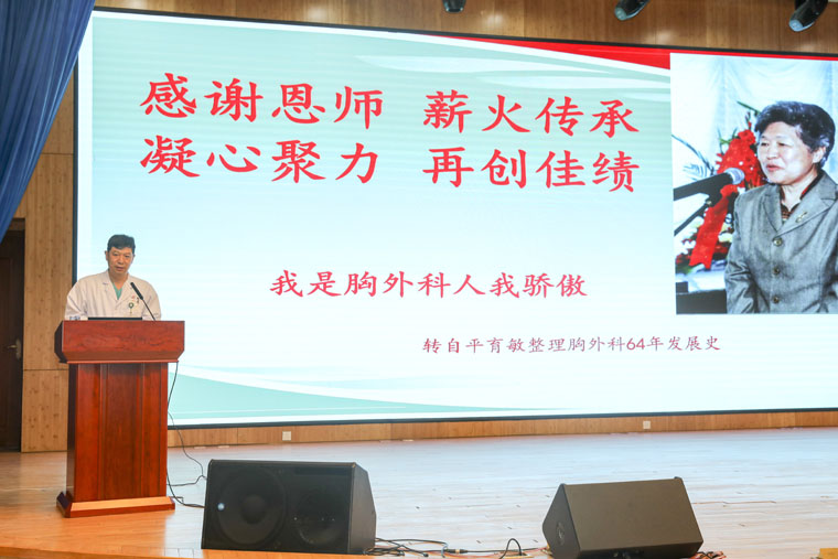 田子強主任著重講述了我院胸外科的發展歷程,他指出,作為國家臨床重點專科,我院胸外科在全國胸外科取得的地位和成績,與老一輩胸外科人艱苦創新、勵精圖治、舉賢任能是分不開的,正是有張毓德、杜喜群、王其彰、平玉敏等老前輩的艱苦奮斗,才為胸外科的建立和發展打下了堅實的基礎。他們開拓、創新、拼搏、奉獻的精神,為胸外科事業發展奮斗終身的堅定意志,都是我們應當傳承和發揚的不朽精神,值得后代每一位胸外科醫師學習、領悟并深刻踐行。