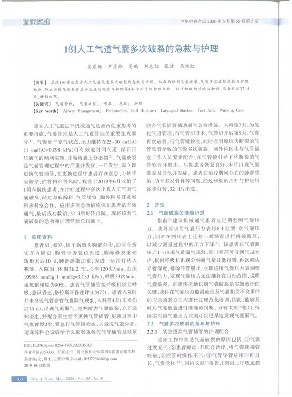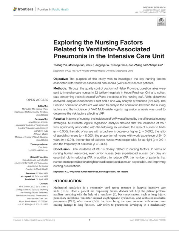 護理人員的科研能力亟待增強,在科室負責人胡振杰和護理部主任李來有的支持下,科室在2018年成立了護理科研小組,尹彥玲護士長帶領著以吳彥爍為組長的科研團隊,從臨床中汲取思路,不斷開拓創新,大力培養護理人員的科研能力。截至目前,ICU護理團隊已經發表SCI論文3篇,中文核心期刊論文20多篇。其中尹彥玲護士長以第一作者發表SCI 2篇,吳彥爍在中華護理雜志發表論文2篇。尹彥玲護士長主持及參與編寫書籍4部,包括人民衛生出版社出版書籍一部。目前,ICU護理科研團隊已初步搭建完成,正在不斷深入推進。