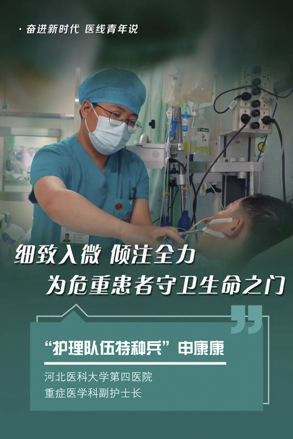 5月12日是第112個國際護士節,在傳統觀念中,“護理”這個職業總是與女性的“溫柔”“細心”等形容詞關聯在一起。近年來,越來越多的男護士加入護理隊伍,他們被親切地稱為“男丁格爾”。河北醫科大學第四醫院ICU的副護士長申康康身為“男丁格爾”,已經扎根在重癥醫學科17年,他不僅用青春詮釋了對護理事業的執著與追求,也用奮斗一次次創造生命的奇跡。