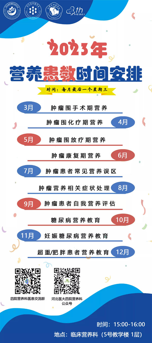 每月最后一個周三下午,臨床營養科營養師會通過線上、線下相結合的形式,對廣大患者進行營養患教,受眾主要是腫瘤、糖尿病及超重/肥胖患者及家屬。每月有1個不同的主題,包括腫瘤不同時期營養干預、營養誤區、相關癥狀處理、自我營養評估及糖尿病、超重/肥胖患者營養教育等內容。患教活動旨在充分發揮臨床營養科的力量,為我院廣大患者及家屬朋友們宣教營養知識,避開營養誤區,輔助臨床醫生更好的治療疾病。