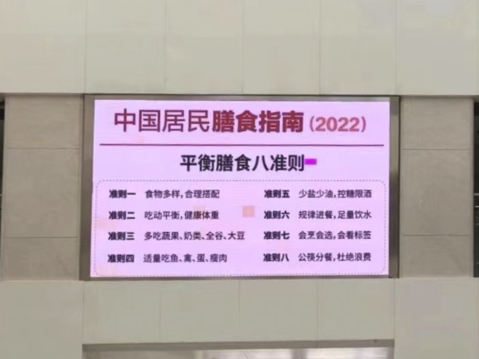 在營養周期間,醫院門診大廳屏幕滾動播放今年的主題及平衡膳食八準則,旨在讓更多患者了解并重視營養,培養健康的膳食習慣。