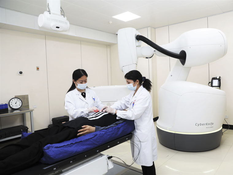 我院射波刀放療系統自2022年10月投入使用以來,已完成百余例腫瘤患者的治療,涵蓋腦瘤、腦轉移瘤、肺癌、肺轉移瘤、骨轉移瘤等多個病種。射波刀可以治療全身各部位腫瘤,一般僅需1至5次照射,即可完成全部放療劑量。我院將充分利用射波刀“高精度、智能化”的優勢,在顱內腫瘤、脊柱旁腫瘤、鄰近重要臟器的腫瘤、容易隨呼吸移動的腫瘤如肺癌、肝癌、胰腺癌等方面深入探索、披荊斬棘,為更多癌癥患者提供高質量的醫療服務。
