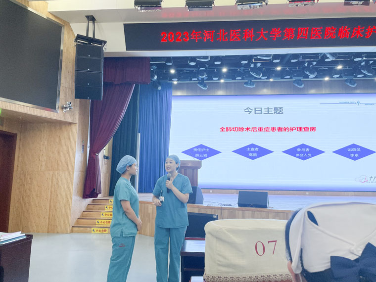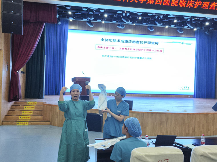 視頻中,主查人引導大家對該患者疾病不同時期的護理重點分別進行討論和總結,期間,重癥醫學科孫莉霄醫生對病例匯報、護理查體及該病人的治療重點和難點等方面給予指導。麻醉復蘇室魏淑艷護士長現場展示了全肺切除患者術中應用的特殊氣管導管,讓大家有了更加直觀的認識。對于該患者的術后快速康復,胸三科殷金環護士長結合目前研究和科室工作進行講解,對下一步護理措施的落實起到指導作用。