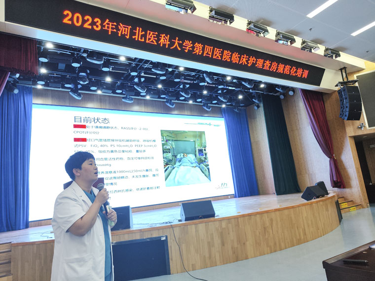 重癥醫學科高鵬副護士長介紹了護理查房的概念、目的、意義、形式及實施程序,幫助大家深化對護理查房的認識。因ICU環境特殊,護理查體環節以視頻的形式展示了一例左肺全切術后患者護理查房的情景,N1級責任護士薛云巖對病例詳細匯報。