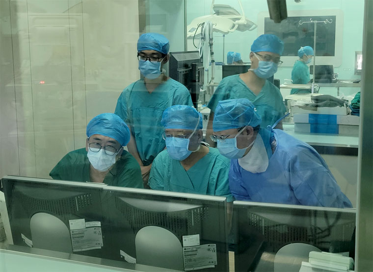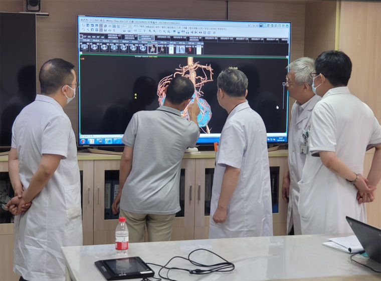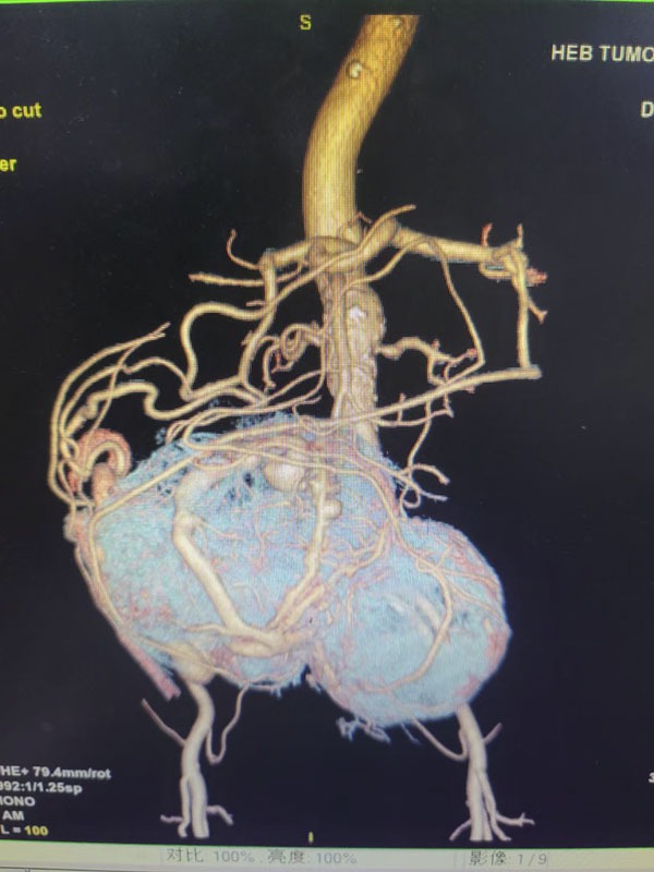 由于病情復雜,完善術前準備后,外三科李勇教授、范立僑教授組織本科聯合心臟血管外科、泌尿外科、放射介入科、CT磁共振科、麻醉科及手術室醫務人員共同研究治療策略。大家圍繞如何減少術中大出血、減少手術并發癥、提高手術成功率等眾多難題進行重點討論,最終決定啟用DSA復合手術室,以便于外科手術與介入手術實現“一站式服務”,術前由介入科醫師行腫瘤供血血管栓塞術,之后外三科醫師行手術切除,并根據術中可能出現的不同情況制定了詳細的手術預案。同時,在血源極為緊張的條件下,輸血科趙學濤主任醫師積極協調,保證供血,為手術的成功啟動提供了先決條件。