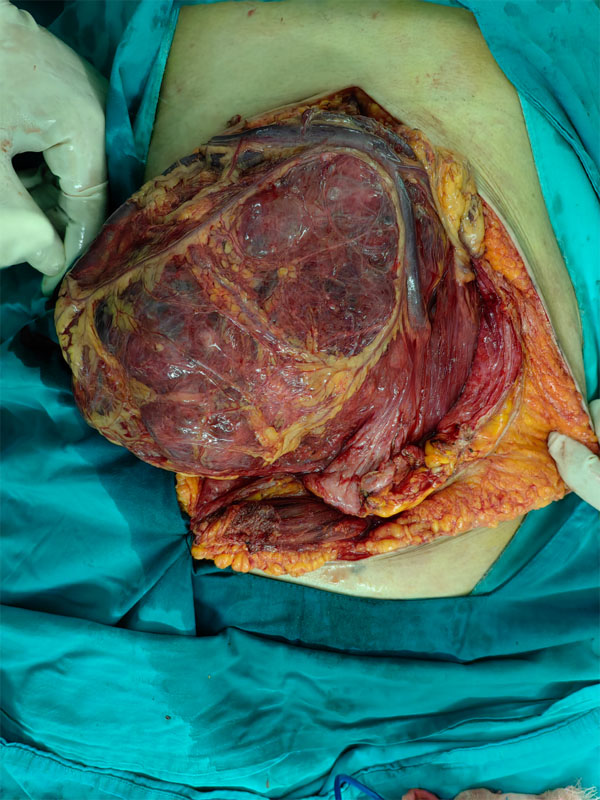 患者為一名72歲女性,今年4月體檢時發現腹盆腔存在巨大腫瘤,且膀胱、直腸出現壓迫癥狀,在外地診治無果后前往我院外三科就診,由李勇教授收治入院。經檢查發現,患者中下腹可觸一質硬、邊界不清、不活動的腫物,病理結果考慮孤立性纖維瘤。CT影像顯示,腫物長徑約20cm,與腸系膜血管、髂血管、右側輸尿管、膀胱、子宮等組織器官關系緊密,同時CT血管三維重建顯示腫瘤表面布滿迂曲粗大的血管,腫瘤血供極為豐富,手術難度和風險極大。