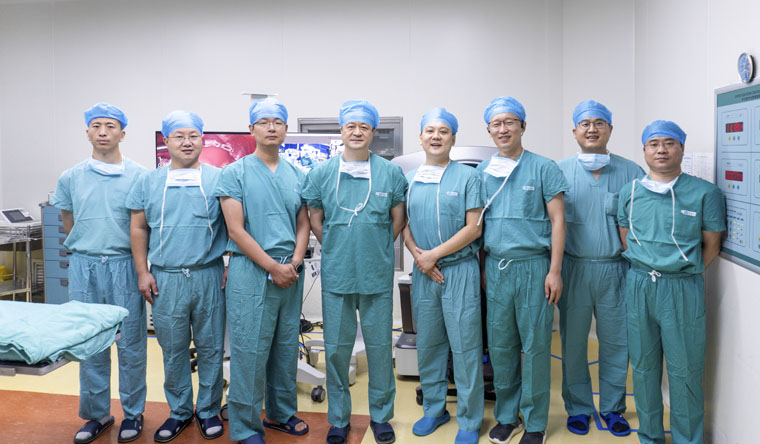 8月11日,我院外三科成功完成我國中東部地區首例機器人輔助下遠程5G胃腫瘤切除術。為保證此次手術順利實施,我院兩院區手術室、麻醉科、信息中心及上海微創公司技術工程團隊與手術團隊成員密切配合,在手術前制定了詳細的手術預案,主端手術室(東院區)內由趙群教授擔當主操作手,郭洪海醫師配合;從端(本部院區患者端)手術室內由張志棟教授、楊沛剛醫師、田園醫師密切協作,手術僅用1小時余。患者術后恢復迅速,3日后順利出院。
