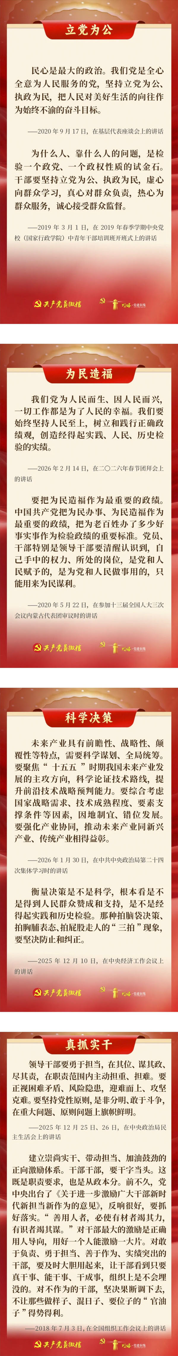 中共中央辦公廳印發《關于在全黨開展樹立和踐行正確政績觀學習教育的通知》,明確把“立黨為公、為民造福、科學決策、真抓實干”這16個字,作為學習教育的總要求。“十五五”開局之年,一起學習習近平總書記相關重要論述,將16字總要求內化于心、外化于行,樹立和踐行正確政績觀,投身強國建設、民族復興的關鍵一程。