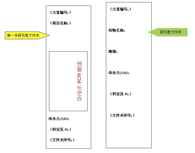 1.研究者文件夾需按歸檔目錄順序放入兩孔黑色硬皮文檔夾中,標記好文件夾序號,項目類別之間用相對應的塑料隔頁紙分隔。側簽自上到下依次包含如下信息:方案編號、藥物名稱(第一本寫項目名稱)、期別、申辦方/CRO、科室及PI、文件夾序號。