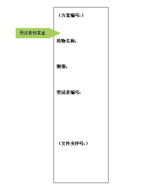 2.受試者的所有文件整理好按照受試者的編號裝入藍色檔案盒,側簽自上到下依次包含如下信息:方案編號、藥物名稱、期別、受試者編號、文件夾序號。